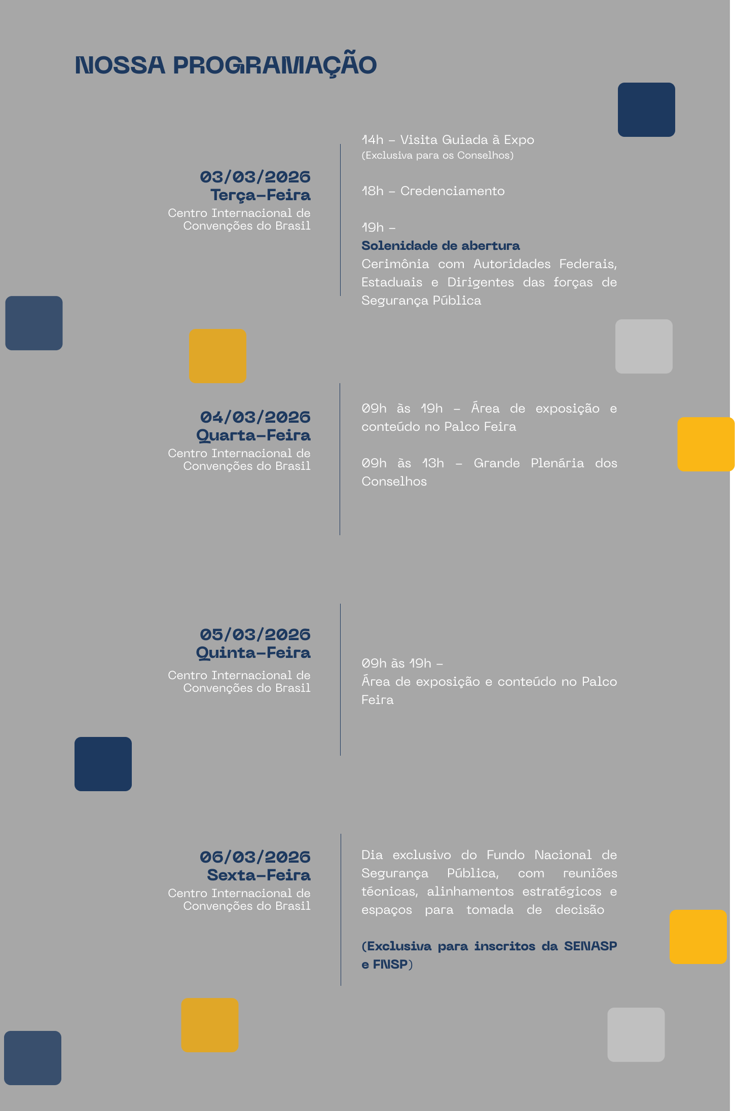 Com a participação de representantes dos 26 estados e do Distrito Federal, o evento consolida-se como um espaço qualificado de articulações entre forças de segurança, órgãos governamentais, especialistas, conselhos nacionais e empresas do setor, promovendo cooperação institucional, integração federativa e soluções orientadas por resultados.